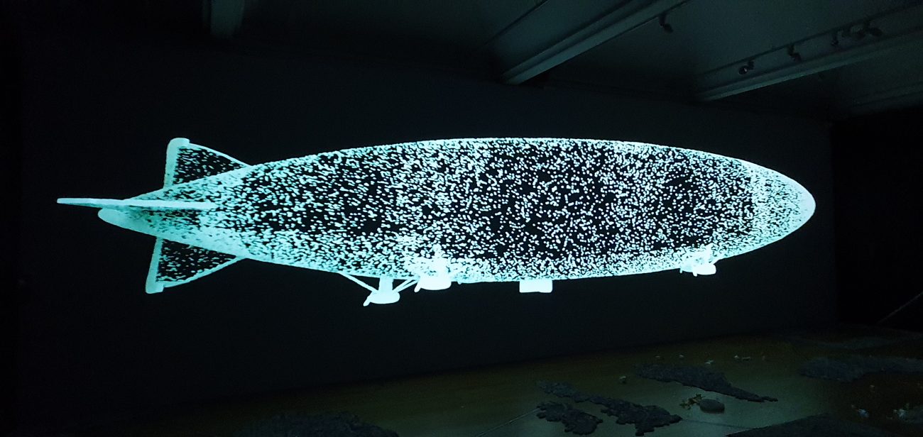 The immersive artwork has been created with a team of artists; Mike Stubbs along with artists Roger Illingworth, Roland Denning, Dave Lynch, Rob Strachan and Sam Weihl. The work fills an entire wall of the exhibition space, using Computer Generated images to represent the life of the R101 Airship built in Bedford. Accompanying the projection is specially composed audio-scape that includes choral voices, the wind and airship sounds to fully engage the audience.
