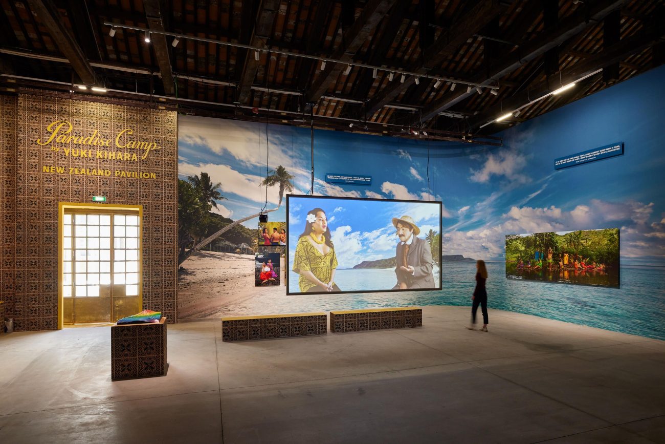 Artist Yuki Kihara presents a multi disciplinary work in Paradise Camp, from the unique perspective of Fa‘afafine a third gender in Sāmoa. Paradise Camp comprises of twelve photographs in saturated colour that upcycle paintings by Paul Gauguin; a “talk show” video projection with a group of Fa‘afafine discuss the Gauguin paintings and Kihara’s personal research archive. Kihara’s audacious re-enactments address intersectionality between decolonisation, identity politics, and climate crisis from a staunchly Pasifika perspective, telling their story from the Pacific.